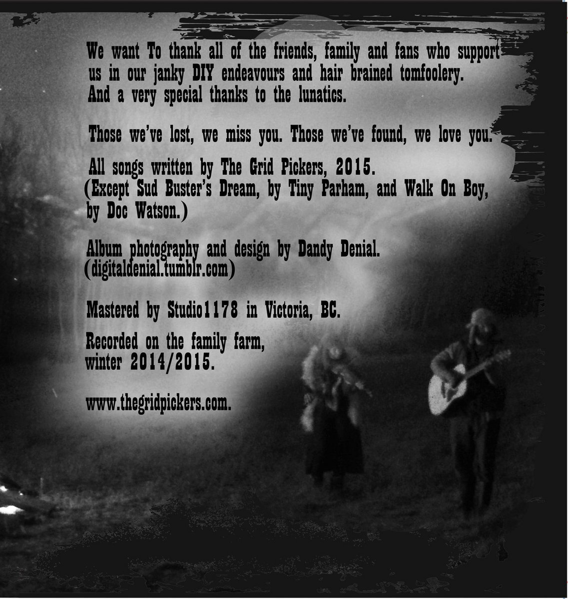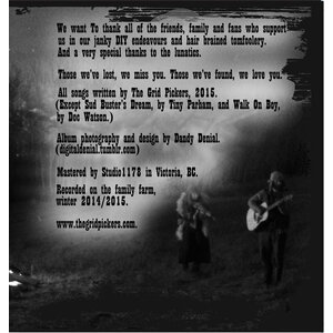 All songs written by The Grid Pickers, 2015 except "Sud Buster's Dream" written by Tiny Parham, and "Walk on Boy", written by Doc Watson