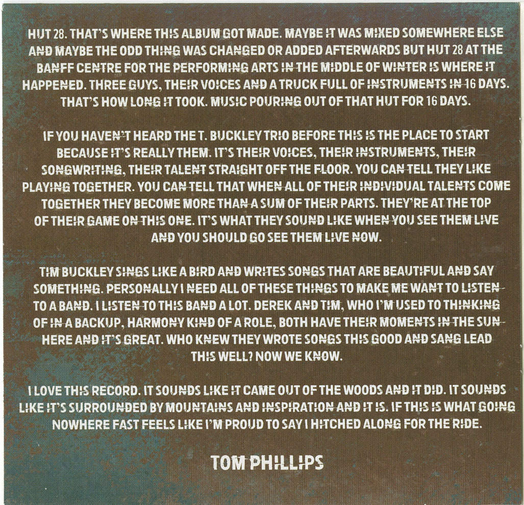 Hut 28. That’s where this album got made. Maybe it was mixed somewhere else, and maybe the odd thing was changed or added afterwards, but Hut 28 at the Banff Centre for the Performing Arts in the middle of winter is where it happened. Three guys, their voices, and a truck full of instruments in 16 days. That’s how long it took—music pouring out of that hut for 16 days.