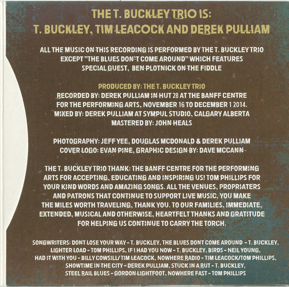 All the music on this recording is performed by The T. Buckley Trio, except “The Blues Don’t Come Around,” which features special guest: Ben Plotnick: fiddle