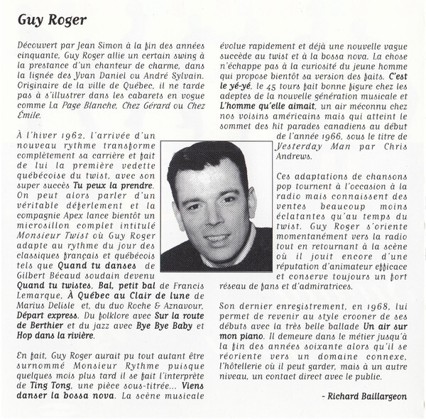 Discovered by Jean Simon in the late 1950s, Guy Roger combined a certain swing with the presence of a charming crooner, in the vein of Yvan Daniel or André Sylvain. Originally from the city of Quebec, he quickly made a name for himself in popular cabarets like La Page Blanche, Chez Gérard, and Chez Émile.