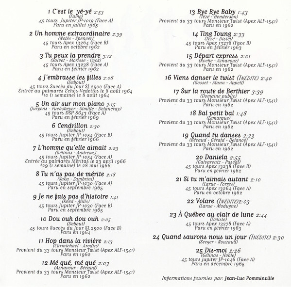 In 2000, his recordings were reissued on CD under the title Swing & Twist (Disques Mérite 22-1161), reintroducing his vibrant performances to a new generation. Tracks like Tu peux la prendre, L’homme qu’elle aimait, and Bye Bye Baby still showcase the playful energy and vocal personality that made him a standout in Quebec’s early pop history.
