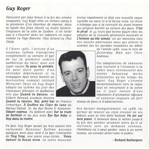 Découvert par Jean Simon à la fin des années cinquante, Guy Roger allie un certain swing à la prestance d’un chanteur de charme, dans la lignée des Yvan Daniel ou André Sylvain. Originaire de la ville de Québec, il ne tarde pas à s’illustrer dans les cabarets en vogue comme La Page Blanche, Chez Gérard ou Chez Émile.