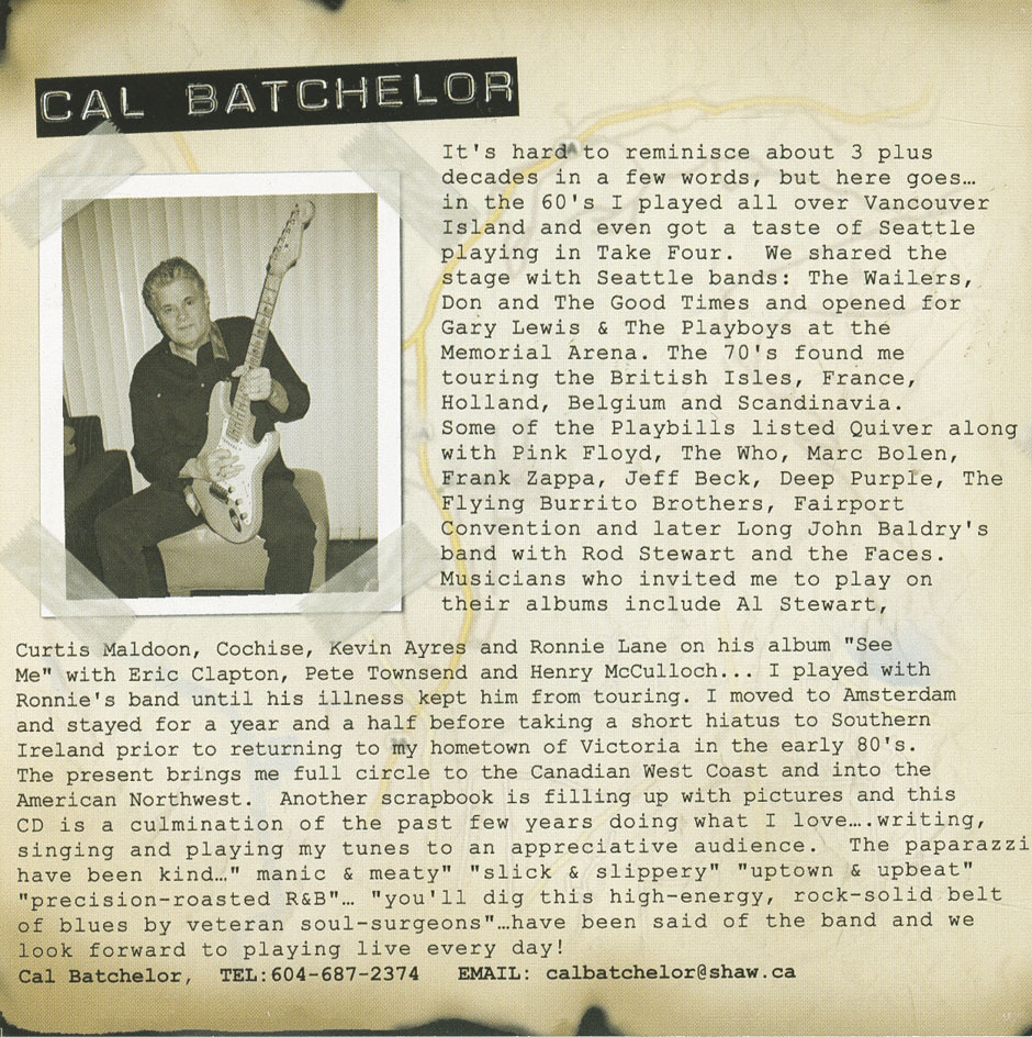 It's hard to reminisce about 3 plus decades in a few words, but here goes... in the 60's I played all over Vancouver Island and even got a taste of Seattle playing in Take Four. We shared the stage with Seattle bands: The Wailers, Don and The Good Times and opened for Gary Lewis & The Playboys at the Memorial Arena. The 70's found me touring the British Isles, France, Holland, Belgium and Scandinavia. Some of the playbills listed Quiver along with Pink Floyd, The Who, Marc Bolen, Frank Zappa, Jeff Beck, Deep Purple, The Flying Burrito Brothers, Fairport Convention and later Long John Baldry's band with Rod Stewart and the Faces. Musicians who invited me to play on their albums include Al Stewart, Curtis Maldoon, Cochise, Kevin Ayres and Ronnie Lane on his album "See Me" with Eric Clapton, Pete Townsend and Henry McCulloch... I played with Ronnie's band until his illness kept him from touring. I moved to Amsterdam and stayed for a year and a half before taking a short hiatus to Southern Ireland prior to returning to my hometown of Victoria in the early 80's. The present brings me full circle to the Canadian West Coast and into the American Northwest. Another scrapbook is filling up with pictures and this CD is a culmination of the past few years doing what I love... writing, singing and playing my tunes to an appreciative audience. The paparazzi have been kind..."manic & meaty" "slick & slippery" "uptown & upbeat" "precision-tooled roots R&B"... "you'll dig this high-energy, rock-solid belt of blues by veteran soul-surgeons"... have been said of the band and we look forward to playing live every day!