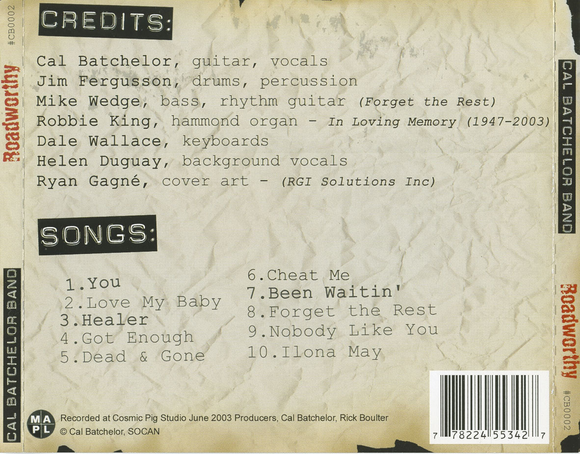 By the 1980s, Batchelor had returned to Canada and settled in Vancouver, where he became a fixture of the city’s blues and R&B circuit. Fronting the Cal Batchelor Band, he built a reputation for fiery live shows and soulful, guitar-driven songs. His independent releases reflect both grit and craft: Now Playing (1998), a horn-driven set of blues-rock originals, and Roadworthy (2003), a tougher, R&B-leaning outing recorded with longtime collaborators Jim Fergusson (drums) and Mike Wedge (bass and guitar). The album also featured Vancouver Hammond master Robbie King (Bobby Taylor & The Vancouvers, Skylark, Brahman, The Hometown Band, Hans Staymer Band), captured in one of his final sessions, and Helene Duguay, a pioneering bassist and vocalist from New Brunswick who rose to prominence in the 1960s with trailblazing girl groups Les Beatlettes and Les Planètes before establishing herself in Vancouver’s music community. Keyboardist Dale Wallace added further depth to the arrangements, rounding out a lineup that embodied Batchelor’s mix of grit, soul, and blues-rock energy.