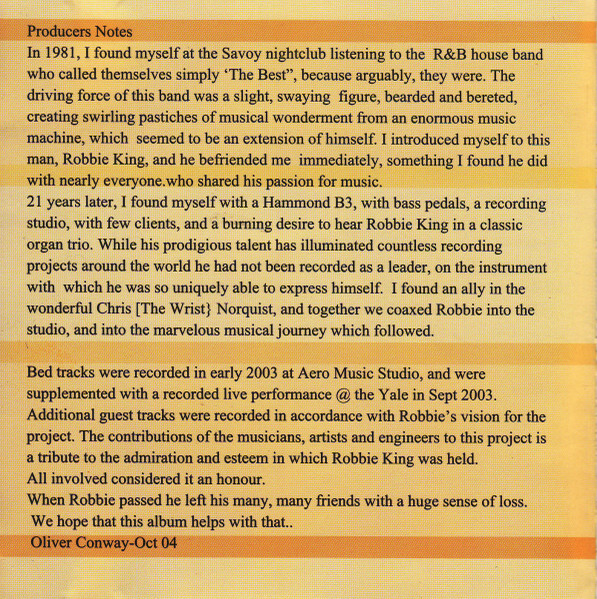 It’s not accurate to call Robbie King an organ player. He simply used one to play Robbie King every track he laid hands on. Imagine a kind man with a quick wit, with a B-3 chopped to pieces and tuned to fit inside the back of his van. He lived on the road and out of a sack, so he could play 15 jobs in a row and make it sound like he had just opened a Pipel organ right down the street from the Conservatory.