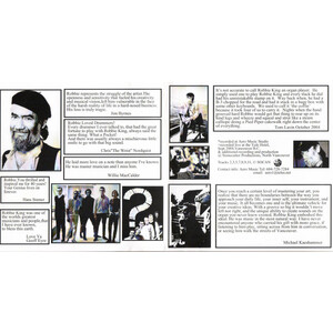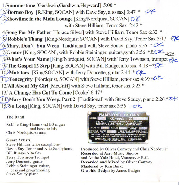 Bed tracks were recorded in early 2003 at Aero Music Studio, and were supplemented with a recorded live performance @ the Yale in Sept 2003. Additional guest tracks were recorded in accordance with Robbie’s vision for the project. The contributions of the musicians, artists and engineers to this project is a tribute to the admiration and esteem in which Robbie King was held. All involved considered it an honour.