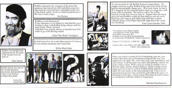 In 2004, the posthumous album Showtime in the Main Lounge captured his B3 at full throttle, recorded both in the studio and live at the Yale, with guest turns from friends like Jerry Doucette. Remembered for his generosity, humor, and unshakable feel, Robbie King remains a touchstone of Vancouver’s music history — a player whose organ could roar like a jet or whisper like a prayer, always with soul at the centre.