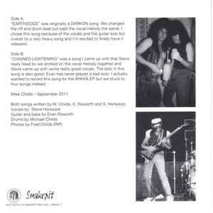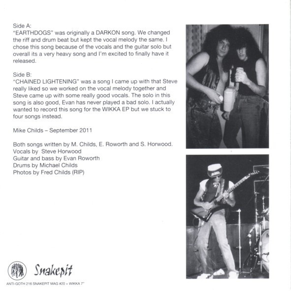Side A: “Earthdogs” was originally a Darkon song. The riff and drum beat were changed but the vocal melody remained the same. Selected for its heavy sound, strong vocals, and guitar solo.