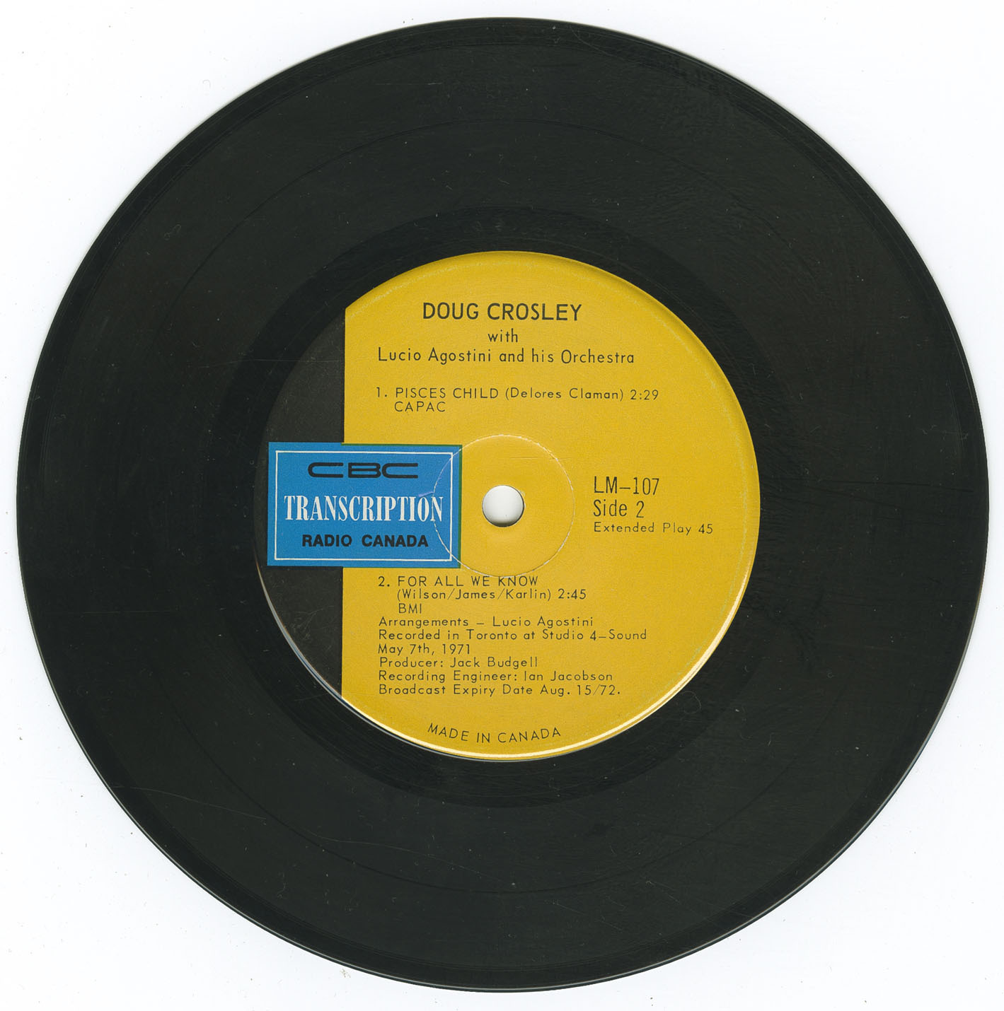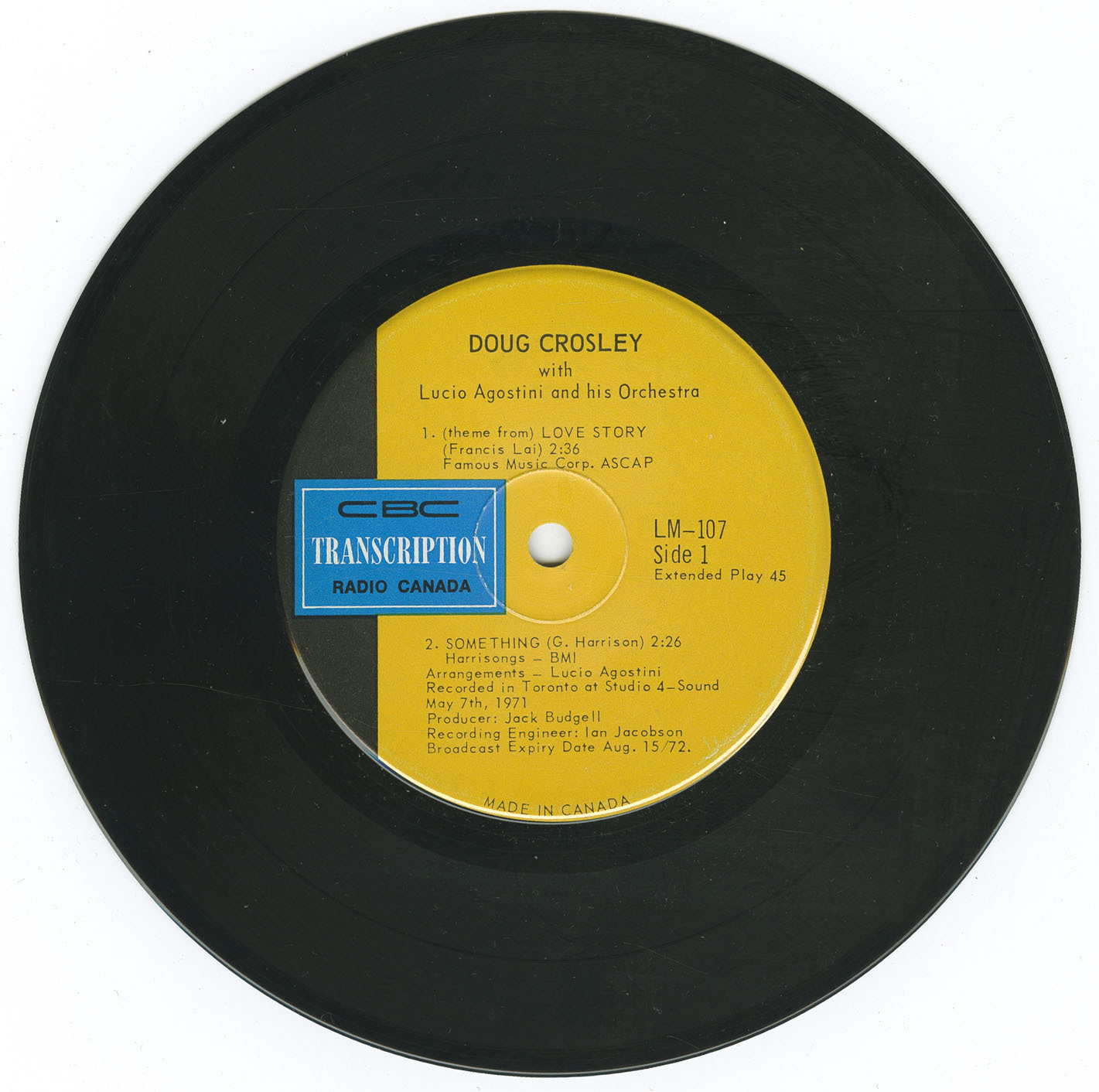 In addition to his commercial releases, Crosley contributed to several broadcast-only LPs produced by CBC Radio Canada. These include From CBC Toronto (LM 30), arranged by Doug Randle, and From CBC Toronto (LM 09) with the Pat Riccio Orchestra — both part of the rare LM series issued for internal broadcast use across the CBC network. He also recorded a rare 1971 CBC 45 titled Doug Crosley – With Lucio Agostini and His Orchestra (LM 107), featuring orchestral renditions of “(Theme from) Love Story,” George Harrison’s “Something,” Dolores Claman’s “Pisces Child,” and “For All We Know,” arranged by Agostini, produced by Jack Budgell, and engineered by Ian Jacobson at Studio 4-Sound in Toronto.